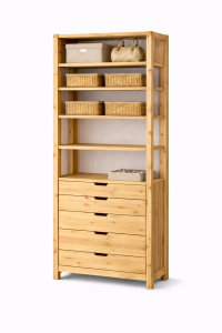 Regał z półkami i szufladami do garderoby wykonany z naturalnego drewna – klejonki sosnowej – to funkcjonalny moduł do przechowywania w przedpokoju, sypialni lub garderobie. Otwarta część z półkami umożliwia wygodną organizację ubrań, koszy i pudełek, natomiast pojemne szuflady pozwalają schować drobne akcesoria. Naturalne usłojenie, sęki i delikatne pęknięcia są charakterystyczną cechą litego drewna i podkreślają autentyczny charakter mebla. Modułowa konstrukcja pozwala łączyć regał z innymi elementami systemu garderobianego, tworząc spójną zabudowę meblową.