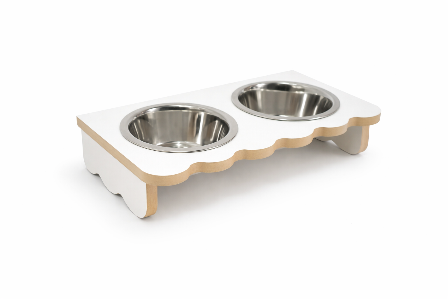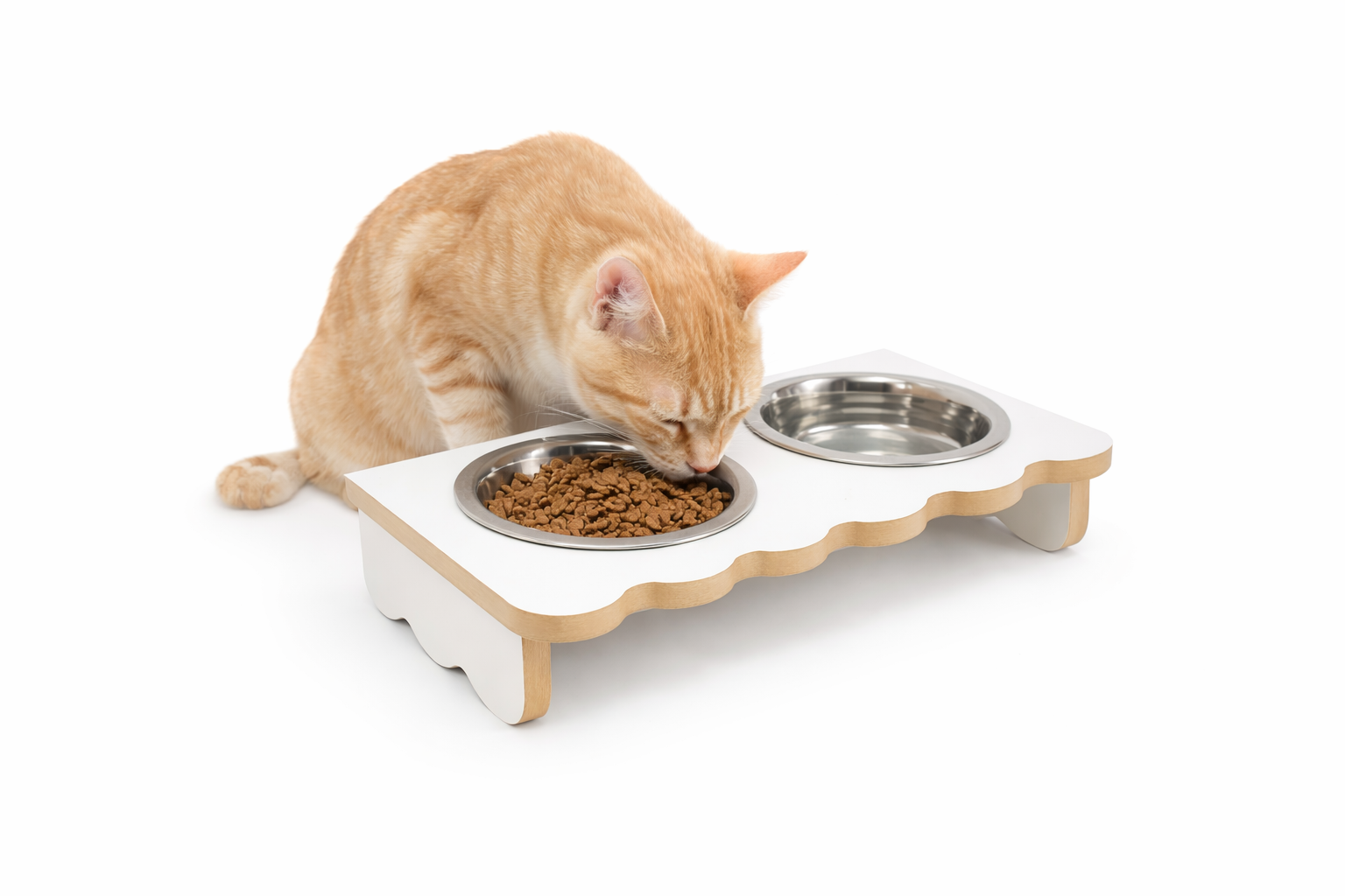 Podwójna miska dla kota z laminowanego MDF 12 mm. Stabilna, podwyższona konstrukcja, stalowe miski i różne wymiary. Idealna do karmy i wody.